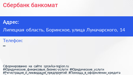 Сбербанк, банкомат по адресу Липецкая область, Боринское, улица Луначарского, 14 в дальнейшем Организация, размещена в следующих категориях: