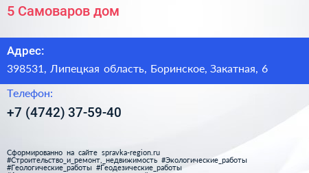 5 Самоваров, дом по адресу 398531, Липецкая область, Боринское, Закатная, 6 в дальнейшем Организация, размещена в следующих категориях: