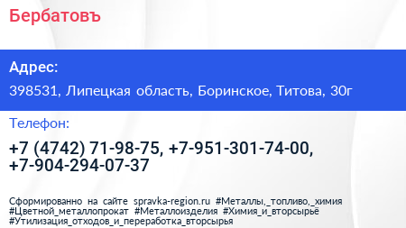 Бербатовъ по адресу 398531, Липецкая область, Боринское, Титова, 30г в дальнейшем Организация, размещена в следующих категориях: