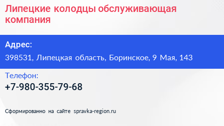 Липецкие колодцы, обслуживающая компания по адресу 398531, Липецкая область, Боринское, 9 Мая, 143 в дальнейшем Организация, размещена в следующих категориях: