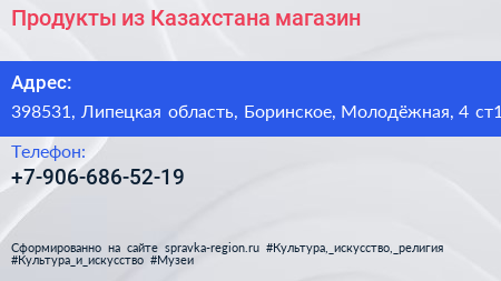Продукты из Казахстана, магазин по адресу 398531, Липецкая область, Боринское, Молодёжная, 4 ст1 в дальнейшем Организация, размещена в следующих категориях: