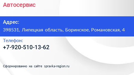 Автосервис по адресу 398531, Липецкая область, Боринское, Романовская, 4 в дальнейшем Организация, размещена в следующих категориях:
