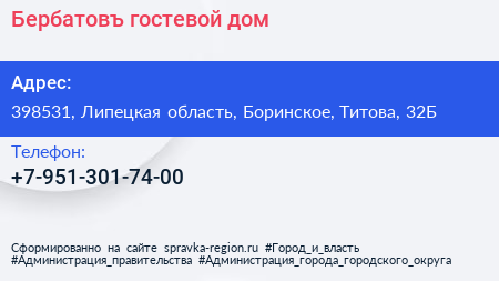 Бербатовъ, гостевой дом по адресу 398531, Липецкая область, Боринское, Титова, 32Б в дальнейшем Организация, размещена в следующих категориях: