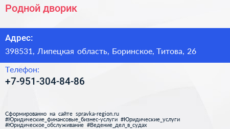 Родной дворик по адресу 398531, Липецкая область, Боринское, Титова, 26 в дальнейшем Организация, размещена в следующих категориях: