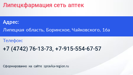 Липецкфармация, сеть аптек по адресу Липецкая область, Боринское, Чайковского, 16а в дальнейшем Организация, размещена в следующих категориях: