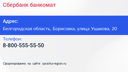 Сбербанк, банкомат по адресу Белгородская область, Борисовка, улица Ушакова, 20 в дальнейшем Организация, размещена в следующих категориях: