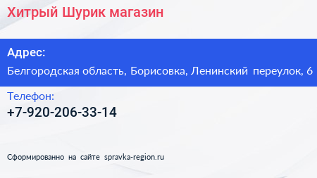 Хитрый Шурик, магазин по адресу Белгородская область, Борисовка, Ленинский переулок, 6 в дальнейшем Организация, размещена в следующих категориях: