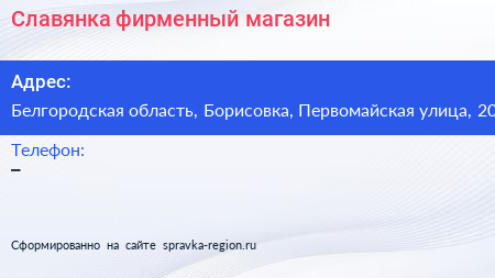 Славянка, фирменный магазин по адресу Белгородская область, Борисовка, Первомайская улица, 20 в дальнейшем Организация, размещена в следующих категориях: