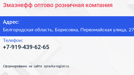 Змазнефф, оптово-розничная компания по адресу Белгородская область, Борисовка, Первомайская улица, 27 в дальнейшем Организация, размещена в следующих категориях: