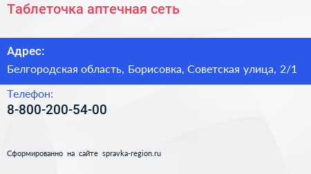 Таблеточка, аптечная сеть по адресу Белгородская область, Борисовка, Советская улица, 2/1 в дальнейшем Организация, размещена в следующих категориях: