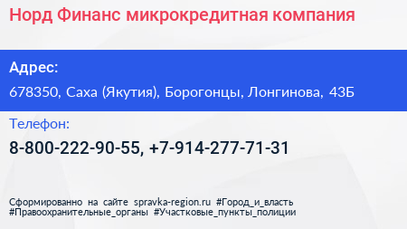 Норд Финанс, микрокредитная компания по адресу 678350, Саха (Якутия), Борогонцы, Лонгинова, 43Б в дальнейшем Организация, размещена в следующих категориях: