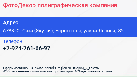 ФотоДекор, полиграфическая компания по адресу 678350, Саха (Якутия), Борогонцы, улица Ленина, 35 в дальнейшем Организация, размещена в следующих категориях: