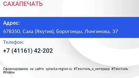 САХАПЕЧАТЬ по адресу 678350, Саха (Якутия), Борогонцы, Лонгинова, 37 в дальнейшем Организация, размещена в следующих категориях: