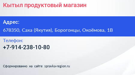 Кытыл, продуктовый магазин по адресу 678350, Саха (Якутия), Борогонцы, Окоёмова, 1В в дальнейшем Организация, размещена в следующих категориях: