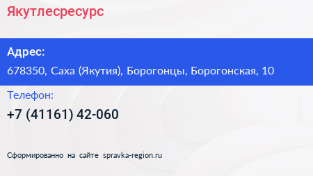Якутлесресурс по адресу 678350, Саха (Якутия), Борогонцы, Борогонская, 10 в дальнейшем Организация, размещена в следующих категориях: