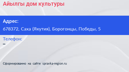 Айылгы, дом культуры по адресу 678372, Саха (Якутия), Борогонцы, Победы, 5 в дальнейшем Организация, размещена в следующих категориях: