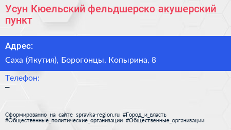 Усун-Кюельский фельдшерско-акушерский пункт по адресу Саха (Якутия), Борогонцы, Копырина, 8 в дальнейшем Организация, размещена в следующих категориях: