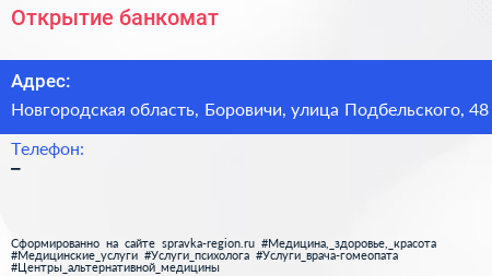 Открытие, банкомат по адресу Новгородская область, Боровичи, улица Подбельского, 48 в дальнейшем Организация, размещена в следующих категориях: