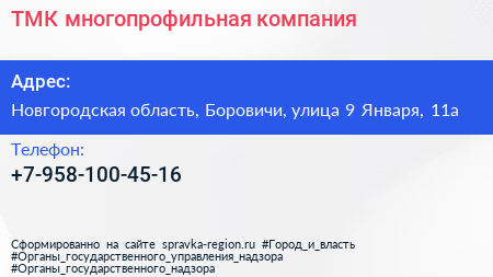 ТМК, многопрофильная компания по адресу Новгородская область, Боровичи, улица 9 Января, 11а в дальнейшем Организация, размещена в следующих категориях: