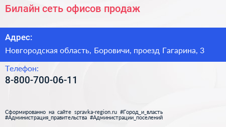 Билайн, сеть офисов продаж по адресу Новгородская область, Боровичи, проезд Гагарина, 3 в дальнейшем Организация, размещена в следующих категориях: