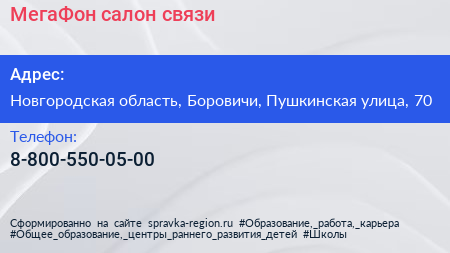 МегаФон, салон связи по адресу Новгородская область, Боровичи, Пушкинская улица, 70 в дальнейшем Организация, размещена в следующих категориях: