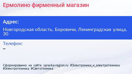 Ермолино, фирменный магазин по адресу Новгородская область, Боровичи, Ленинградская улица, 30 в дальнейшем Организация, размещена в следующих категориях:
