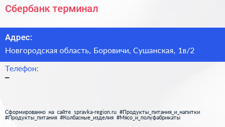 Сбербанк, терминал по адресу Новгородская область, Боровичи, Сушанская, 1в/2 в дальнейшем Организация, размещена в следующих категориях: