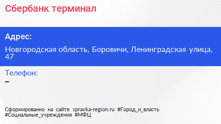 Сбербанк, терминал по адресу Новгородская область, Боровичи, Ленинградская улица, 47 в дальнейшем Организация, размещена в следующих категориях: