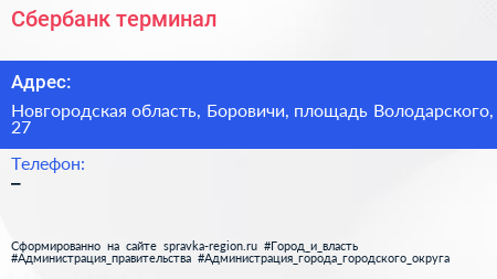 Сбербанк, терминал по адресу Новгородская область, Боровичи, площадь Володарского, 27 в дальнейшем Организация, размещена в следующих категориях: