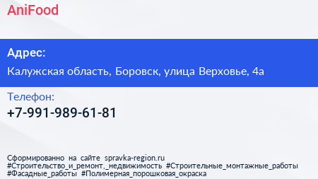 AniFood по адресу Калужская область, Боровск, улица Верховье, 4а в дальнейшем Организация, размещена в следующих категориях: