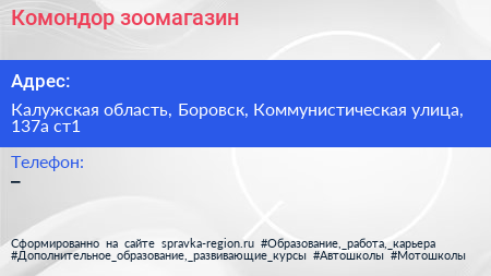 Комондор, зоомагазин по адресу Калужская область, Боровск, Коммунистическая улица, 137а ст1 в дальнейшем Организация, размещена в следующих категориях: