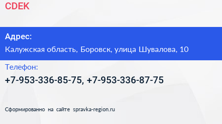 CDEK по адресу Калужская область, Боровск, улица Шувалова, 10 в дальнейшем Организация, размещена в следующих категориях: