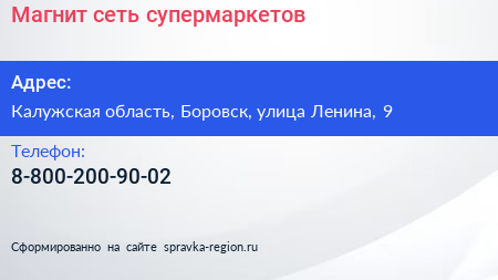 Магнит, сеть супермаркетов по адресу Калужская область, Боровск, улица Ленина, 9 в дальнейшем Организация, размещена в следующих категориях: