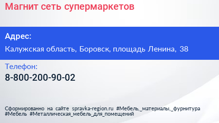 Магнит, сеть супермаркетов по адресу Калужская область, Боровск, площадь Ленина, 38 в дальнейшем Организация, размещена в следующих категориях: