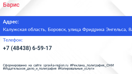 Барис по адресу Калужская область, Боровск, улица Фридриха Энгельса, 8а в дальнейшем Организация, размещена в следующих категориях: