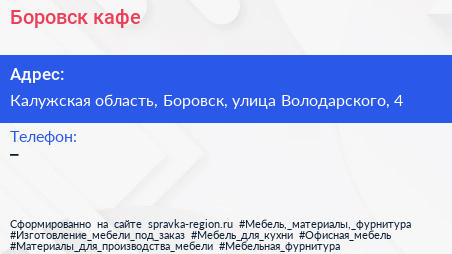 Боровск, кафе по адресу Калужская область, Боровск, улица Володарского, 4 в дальнейшем Организация, размещена в следующих категориях:
