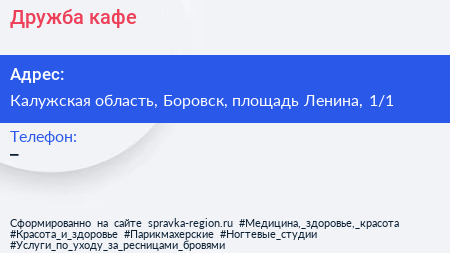 Дружба, кафе по адресу Калужская область, Боровск, площадь Ленина, 1/1 в дальнейшем Организация, размещена в следующих категориях: