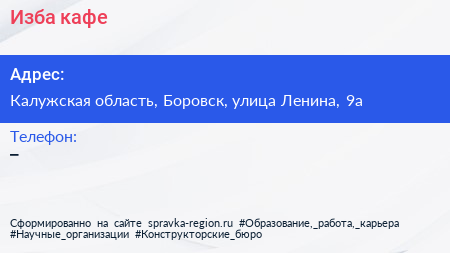 Изба, кафе по адресу Калужская область, Боровск, улица Ленина, 9а в дальнейшем Организация, размещена в следующих категориях: