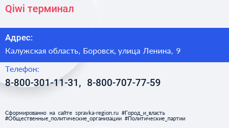 Qiwi, терминал по адресу Калужская область, Боровск, улица Ленина, 9 в дальнейшем Организация, размещена в следующих категориях: