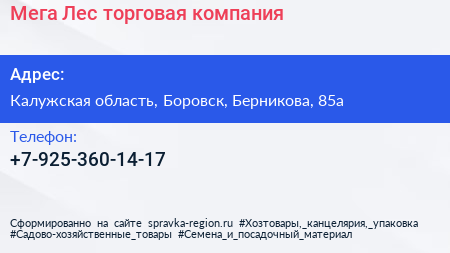 Мега-Лес, торговая компания по адресу Калужская область, Боровск, Берникова, 85а в дальнейшем Организация, размещена в следующих категориях: