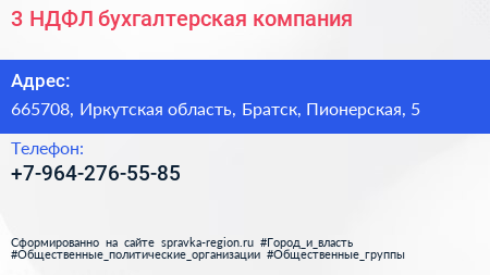3-НДФЛ, бухгалтерская компания по адресу 665708, Иркутская область, Братск, Пионерская, 5 в дальнейшем Организация, размещена в следующих категориях: