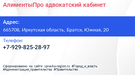 АлиментыПро, адвокатский кабинет по адресу 665708, Иркутская область, Братск, Южная, 20 в дальнейшем Организация, размещена в следующих категориях: