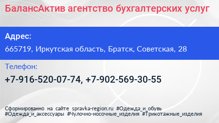 БалансАктив, агентство бухгалтерских услуг по адресу 665719, Иркутская область, Братск, Советская, 28 в дальнейшем Организация, размещена в следующих категориях: