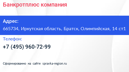 Банкротплюс, компания по адресу 665734, Иркутская область, Братск, Олимпийская, 14 ст1 в дальнейшем Организация, размещена в следующих категориях:
