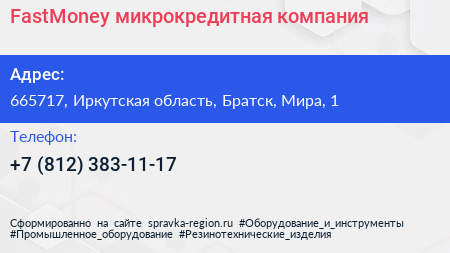 FastMoney, микрокредитная компания по адресу 665717, Иркутская область, Братск, Мира, 1 в дальнейшем Организация, размещена в следующих категориях: