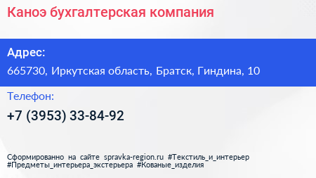 Каноэ, бухгалтерская компания по адресу 665730, Иркутская область, Братск, Гиндина, 10 в дальнейшем Организация, размещена в следующих категориях: