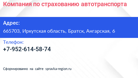 Компания по страхованию автотранспорта по адресу 665703, Иркутская область, Братск, Ангарская, 6 в дальнейшем Организация, размещена в следующих категориях: