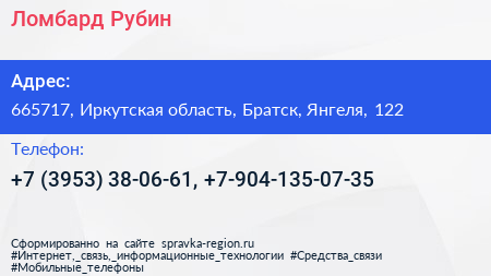 Ломбард Рубин по адресу 665717, Иркутская область, Братск, Янгеля, 122 в дальнейшем Организация, размещена в следующих категориях: