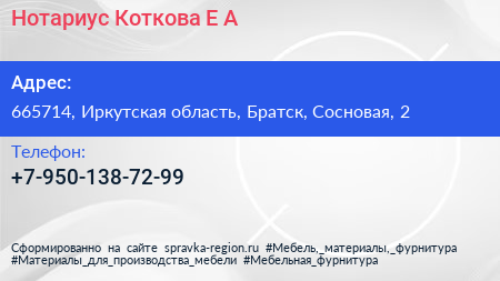 Нотариус Коткова Е.А. по адресу 665714, Иркутская область, Братск, Сосновая, 2 в дальнейшем Организация, размещена в следующих категориях: