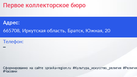 Первое коллекторское бюро по адресу 665708, Иркутская область, Братск, Южная, 20 в дальнейшем Организация, размещена в следующих категориях: